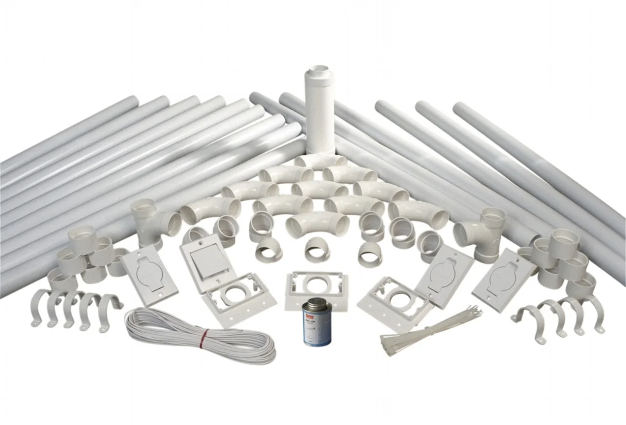 Pakkeløsning med rør og deler for montering av rørsystemet til Flexit sentralstøvsugere.